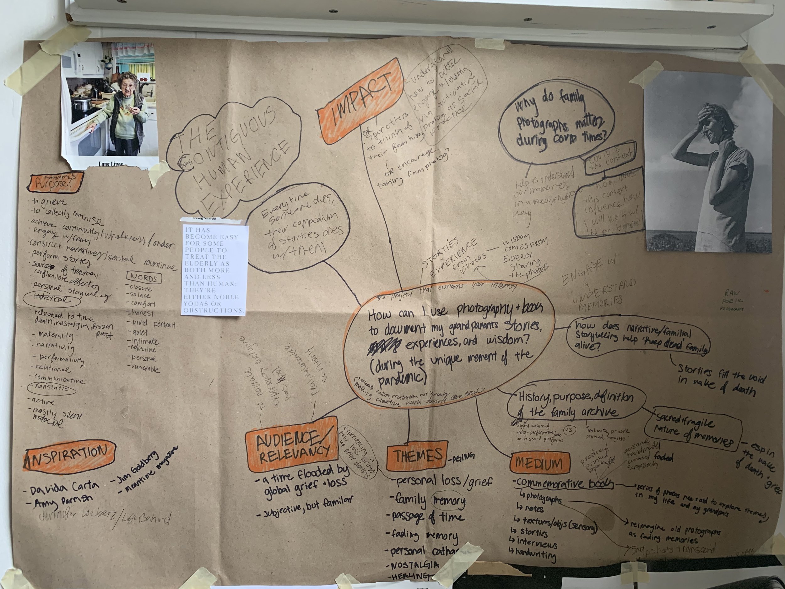 COVID has created a sharp break from our previous life activities, resulting in feelings of isolation, anonymity, and loneliness. As of November 2020, more than 250,000 people have died from COVID-19 in the United States, a majority of which were 65 years or old. In such incomprehensible circumstances, the eldery are facing increased loneliness and isolation, on top of their increased vulnerability to this virus. Such an insurmountable loss of lives equates to a loss of stories, experiences, and wisdom. The wisdom and experiences from the elderly often reveal themselves through the stories they share about family photographs. My research analyzed how a study conducted in an Irish assisted-living facility found the construction of life story books gave elderly patients a medium to prompt their own storytelling and reflection of their lives; likewise, giving them space to talk about their experiences. These autobiographical books included photographs, personal essays, and other memorabilia pertinent to the person’s life in order to give the patients a sense of identity and a holistic view of their lives. The goal of the books was twofold: to allow the elderly person a space to share their memories and life experiences, but also allow these personal experiences to inform and be the basis of individualized patient care at the facility.